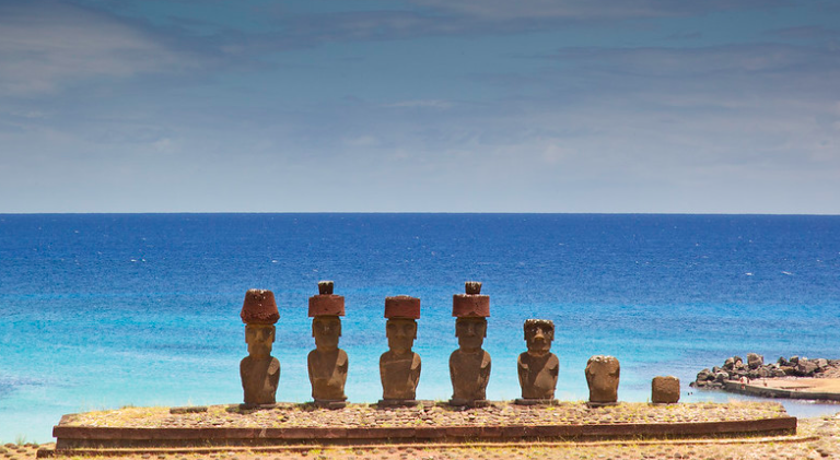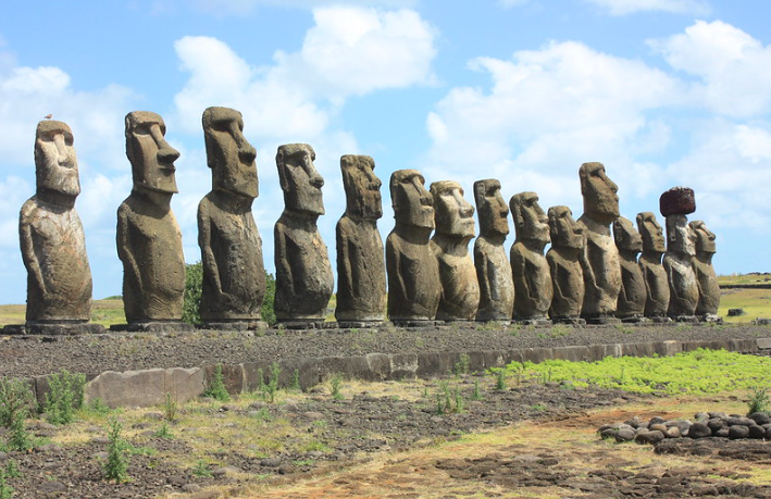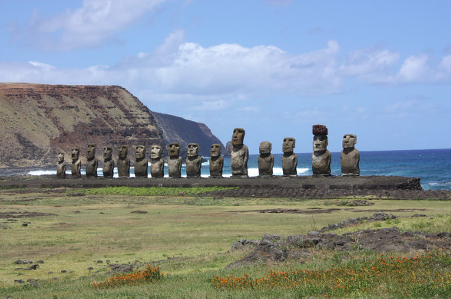 Ahu Tongariki: Az egyik legnagyobb és leglátványosabb moai gyűjteménynél kezdjük a túránkat, ahol 15 monumentális kőszobor áll egymás mellett.